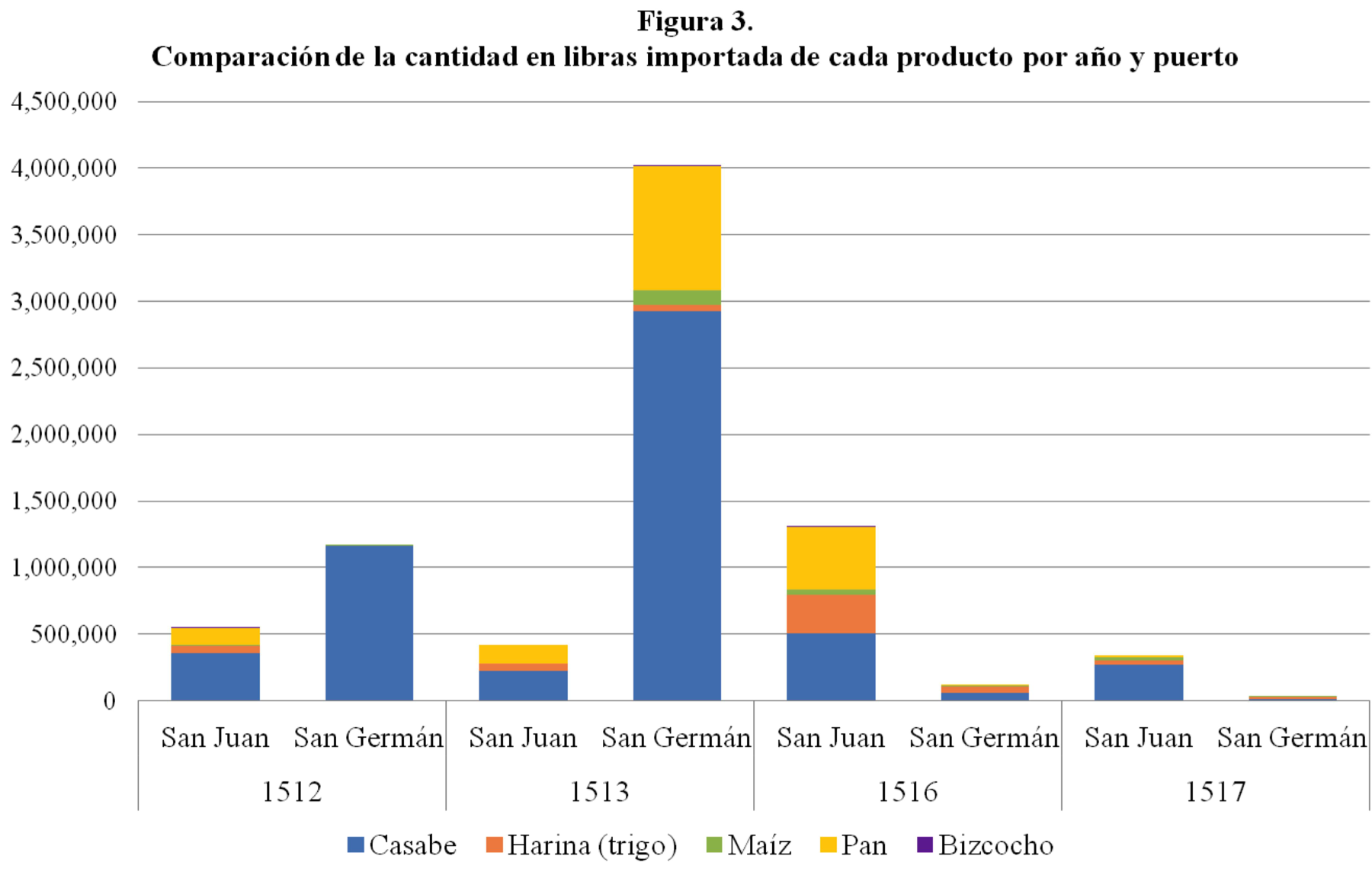 San Germán recibió más navíos que San Juan en estos cuatro años. Su cercanía a La Española, que era la sede de gobierno en las Indias en ese momento, posiblemente le facilitó su inclusión en las rutas comerciales; mientras a San Juan, por encontrarse más lejos, le pasó lo opuesto. En la Figura #2, se presentan los resultados de la cantidad de entradas de cada producto por año a cada puerto. Claramente, se puede observar que los registros con más entradas son San Germán en el 1513 (con casabe componiendo la mayoría, seguido por maíz y pan) y San Juan en el 1516 (con harina componiendo la mayoría, seguido por casabe, maíz y pan). San Juan parece haber tenido una mayor variedad de importaciones, incluyendo productos europeos; mientras que el patrón en San Germán fue mucho más variable (en el 1512 su muestra parece componerse casi en su totalidad por casabe; en 1516, de harina; y, en el 1513 presenta mayor variabilidad). Sin embargo, si lo comparamos con la Figura #3, vemos cómo en cada uno de los casos el producto más importado en libras fue el casabe. Aun cuando había variedad en las entradas de productos, el casabe era el producto más importado en masa a ambos puertos.